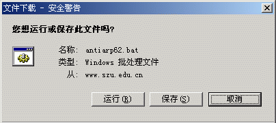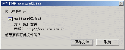360安全卫士、AntiARP等防ARP工具是较好的解决办法,对于部分不愿意安装此类软件的用户,亦可自行通过手工办法来抑制网内ARP的攻击。为了便于用户操作,网络中心提供简便的脚本程序来实现用户主机端对网关IP和MAC的绑定操作: 1、打开校内部网首页→用户服务(网络服务)→网页右侧[“防御ARP”脚本],将弹出以下对话框  (IE浏览器)  (FireFox浏览器) 2、用户网段的不同所对应文件名“antiarp???.bat”也会不一样,其中???即对应用户的网段。用户可点击“保存”下载到本机后再双击运行,或点击“运行”按钮直接运行 3、建议用户将该文件保存在计算机上,在遭遇ARP攻击导致网络时通时断或上不了网时运行即可 注:运行此脚本文件只在本次开机状态有效,下次开机后需再次运行绑定网关。由于网络设备老旧,网关端还做不了相应绑定,以上手工方法可在一定程度上抑制ARP的攻击。